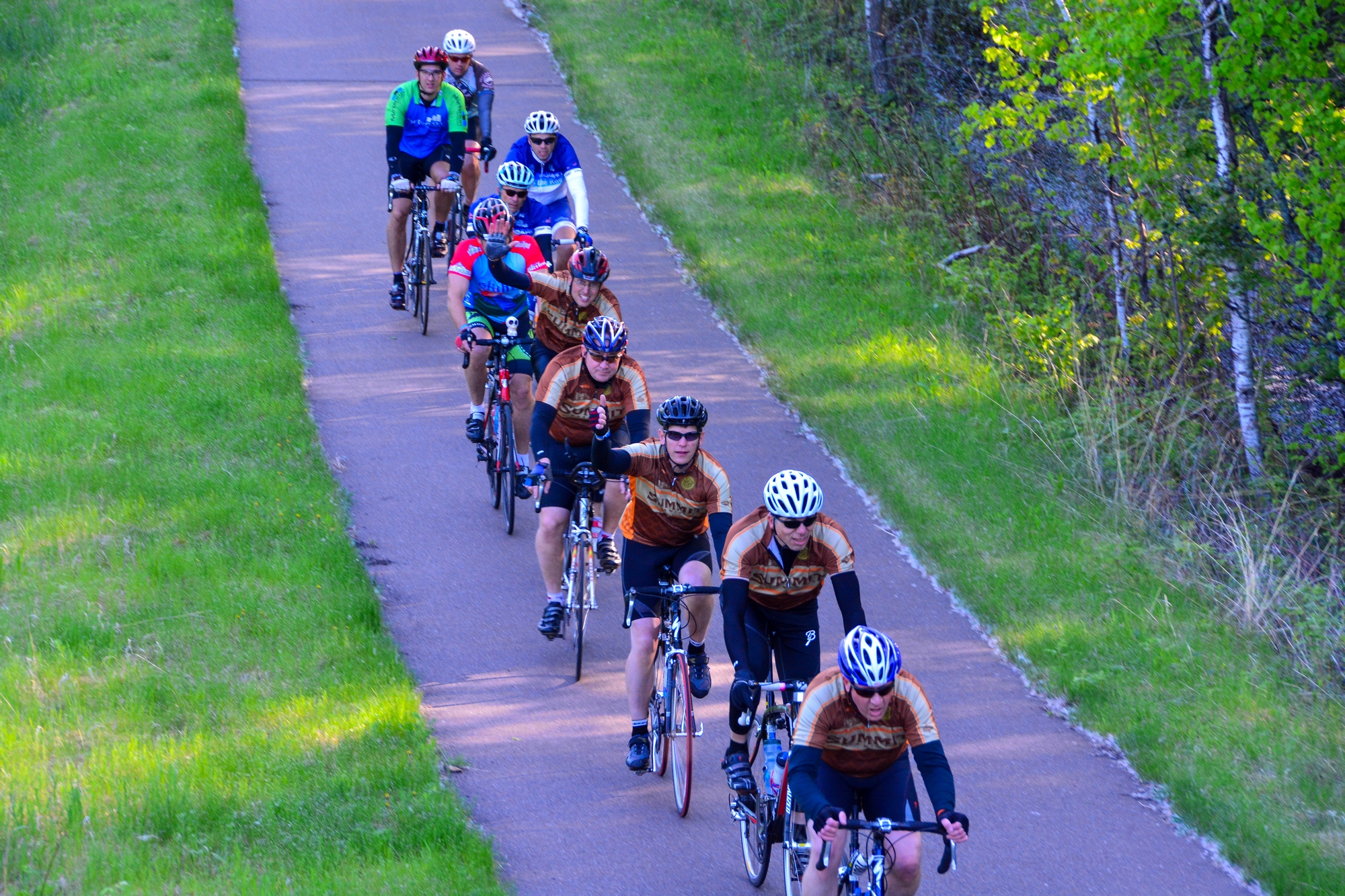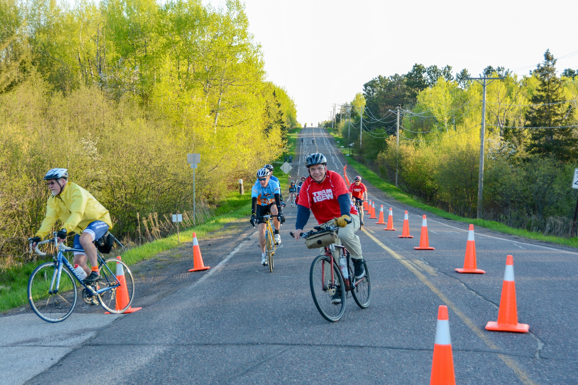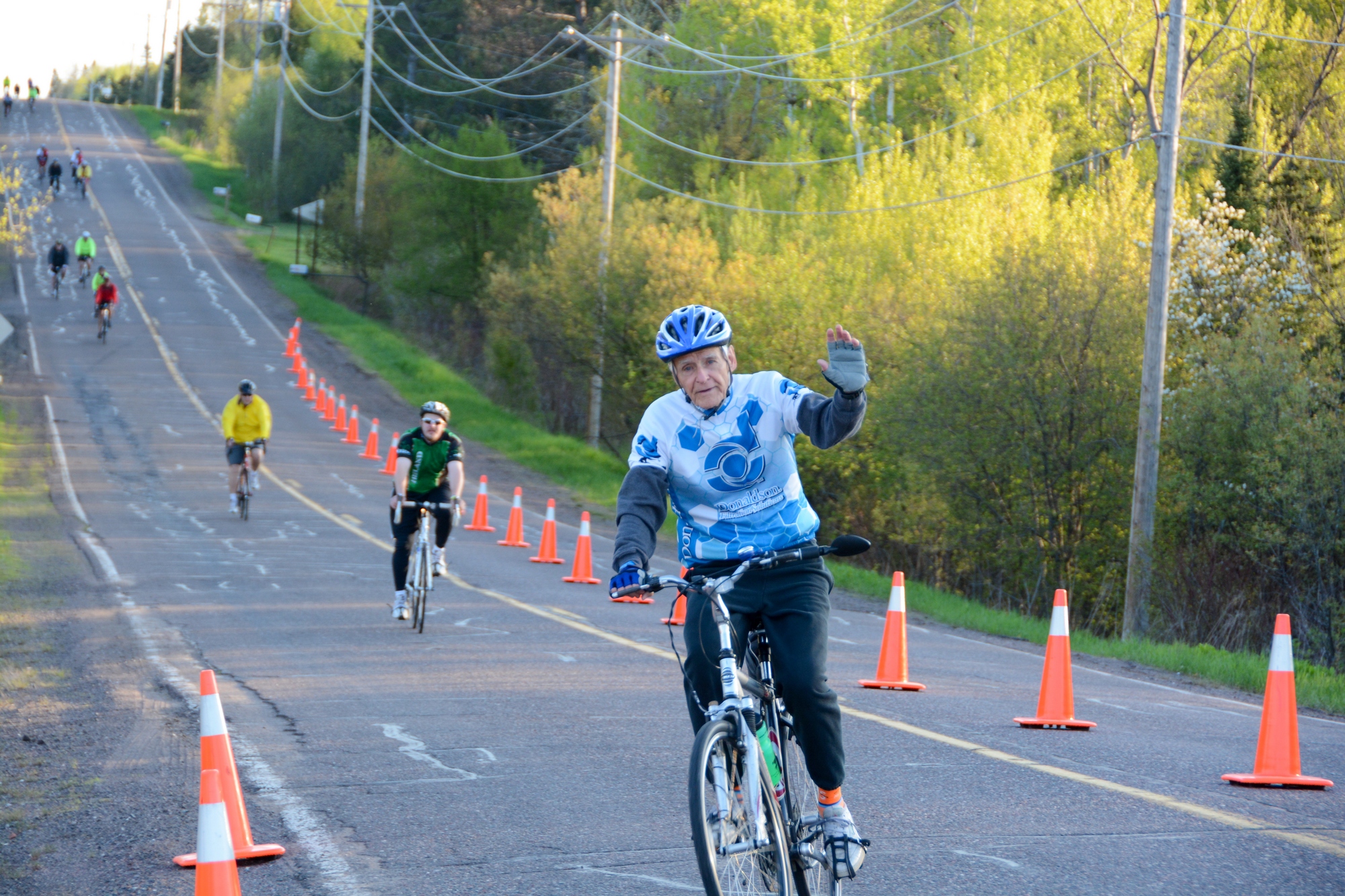 Some of the earliest riders coming down Ugstad Road from Proctor High School, signalling the start of the 2013 MS150 Bike-a-thon